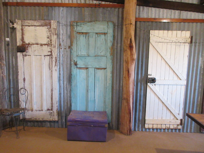 And what a find Billy O’s turned out to be. Mark is the owner and quite the craftsman. He’s collected a stack of old buildings, rebuilt some more and cover the entire property with old memorabilia. It’s a lot of stuff but it’s not tacky. In fact, he’s mixed in a good deal of his bush humour. One of my biggest challenges is picking the door of the day. Mark has hundreds of them scattered the place. He’s set the three of us up in the old shearers shed where we have cots and swags.