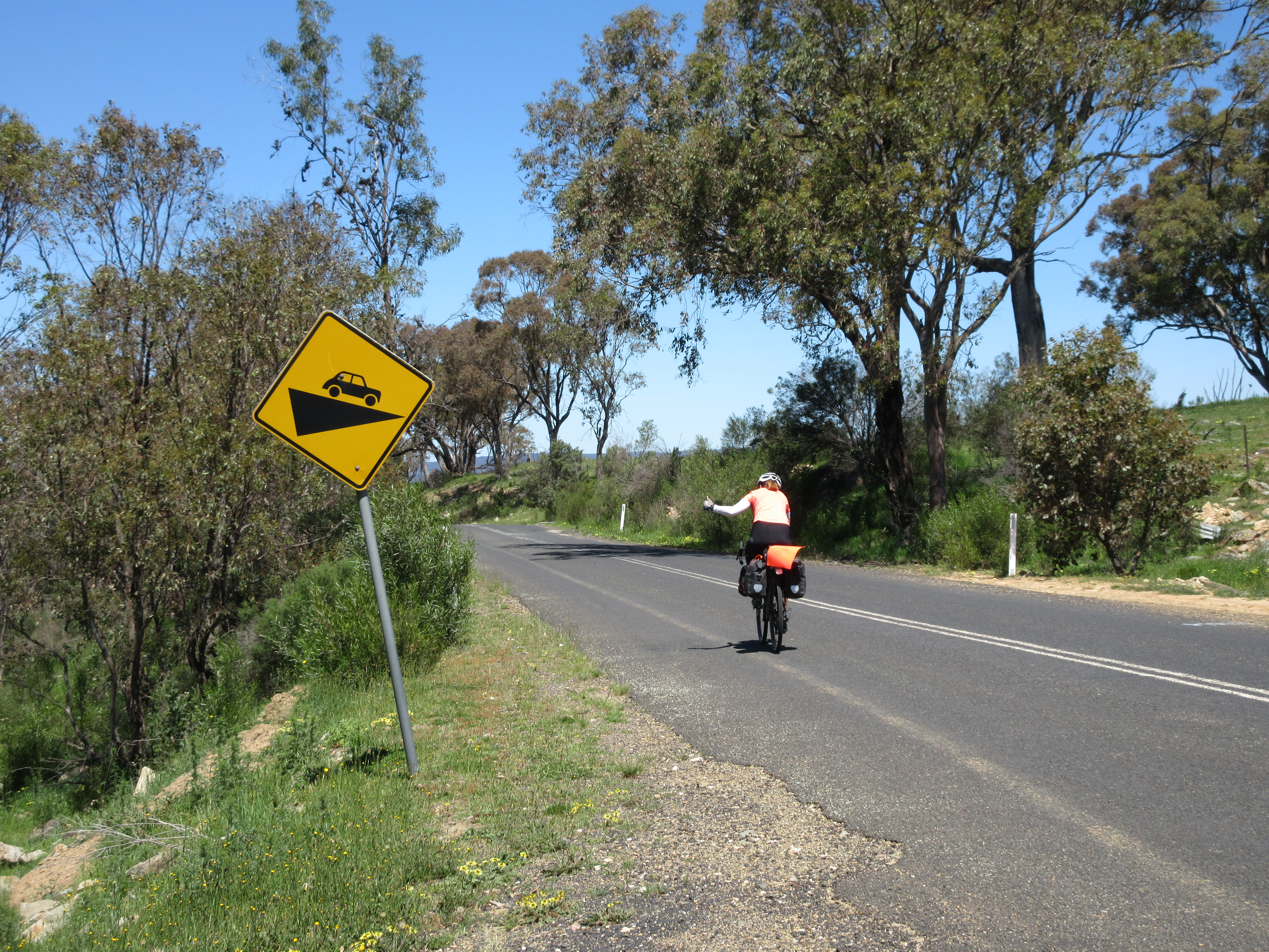 At the end of the short-cut we turned right on Hill End Road. We stayed on this for the rest of the day. Traffic was heavier at the bottom but thinned as we got further and further from Mudgee. The first part of Hill End Road was gentle to slightly uphill. After about 50km we started she serious climbing. There was one short steep climb, followed by an equally steep and super long pull up to the small burg of Hargraves. We didn’t expect to find any stores today but Hargraves had a small shop. They didn’t have a big selection but we got some drinks and ate our peanut butter and jelly sandwiches. The woman running the store was impressed we’d ridden up the hill but this had to be taken with a grain of salt as the shop was filled with smoke from her cigarettes. I’m surprised that the smoke alarm wasn’t set off.