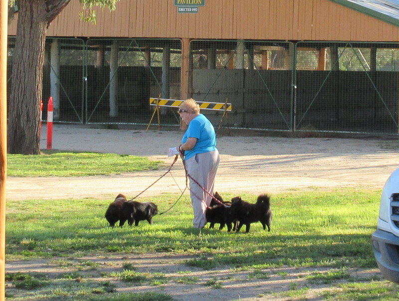 It was a very chilly night in the tent last night – the thermometers on the bike computers read 3C (37.5 for our Fahrenheit friends). And, in case you thought Dave was fibbing in the post yesterday about our neighbour, here is a photo of dog lady trying to walk her dogs this morning. Actually, we didn’t hear them barking much last night after it got dark and the walkabout this morning provided some entertainment viewing while we ate our breakfast.