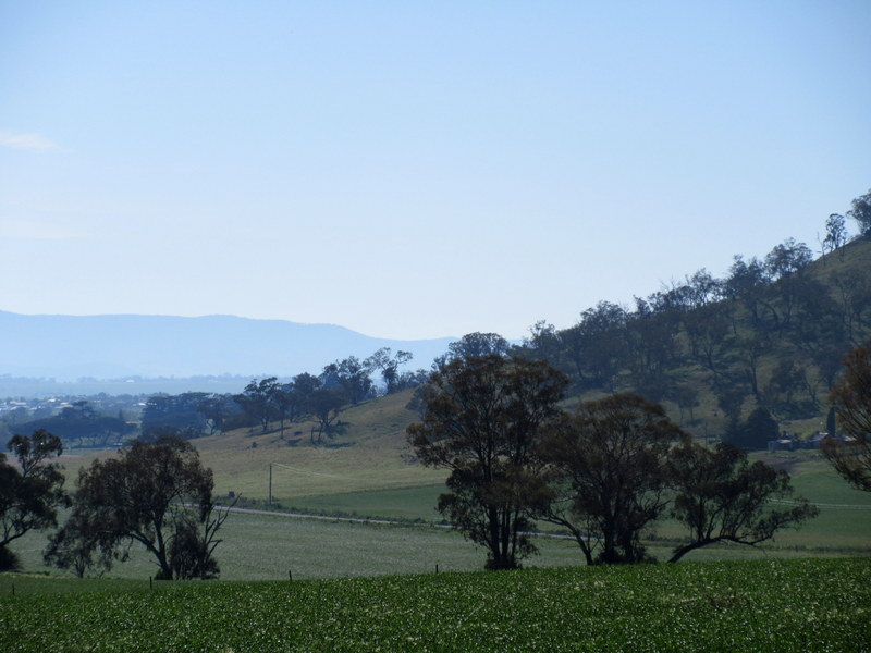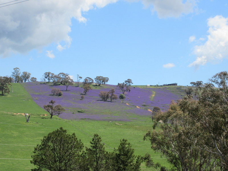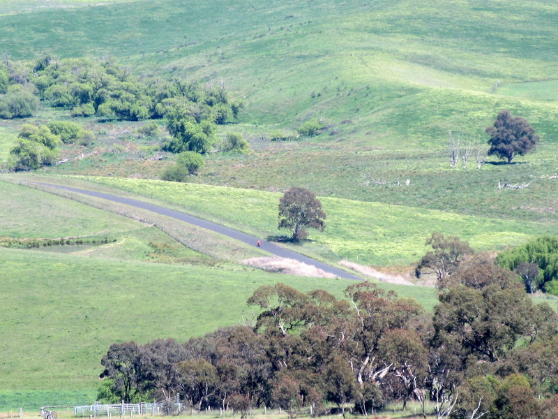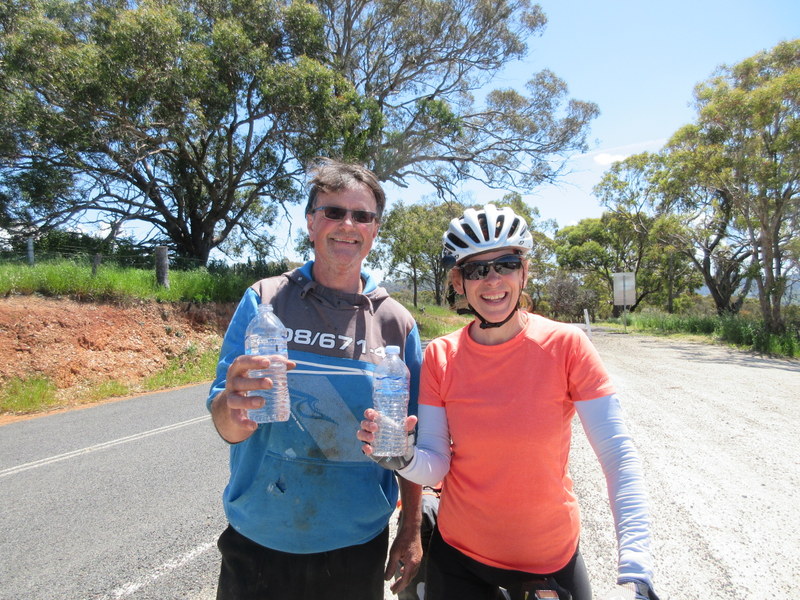 There were no towns or services along the way today, just small localities, so we finally stopped at the only junction of the day to eat a couple of PB&J sandwiches in the shade of a tree. Despite the very chilly morning it was now quite warm in the sun and we were seeking shade when we could find it. A few more ups and downs and after a fairly steep sustained climb (where Dave registered 13%) a ute pulled over and a fellow got out holding up a couple of bottles of water. Joe, an immigrant from Croatia who had a farm nearby, had been a cyclist himself and wanted to chat about the bikes and riding in general. The nice cold water hit the spot, and it was fun to have a break and chat with a local.