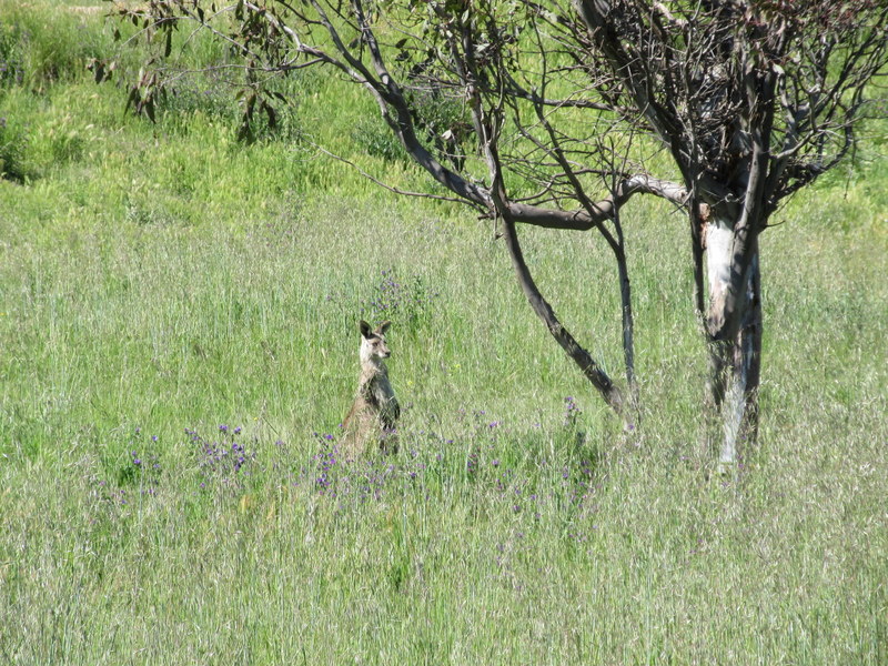 There were lots of stops to take pictures, and at one point I was ahead of Dave and pulled over in the shade of a tree to wait for him. As I pulled to a stop a kangaroo popped his head up just on the other side of the fence – I am not sure who was more startled. He sat there long enough I thought I’d take a picture but of course by the time I got my phone out he bounced away. We saw him a few hundred meters ahead though and he posed nicely under a nearby tree for Dave to get a picture.