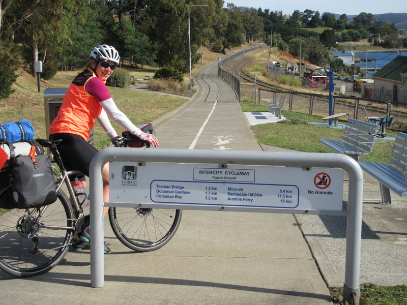 We’re rolling – our round Tasmanian adventure has begun. We had a perfect start with bright blue skies this morning in Hobart. Getting out of town could not have been easier. Being Sunday probably helped, but traffic would not have been an issue anyway as within two blocks of the YHA we were on the 15.6km Intercity Cycleway heading up the Derwent River. What a great resource the cycleway is – today it was full of cyclists of all shapes and sizes. We joined the mob and got out of the city without having to deal with any traffic.