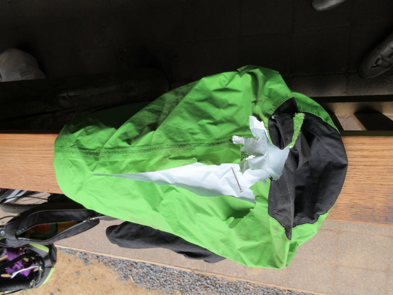 I ran full speed in the direction of the object – yes in my skivvies and flip-flops. I had to crawl under a bunch of bushes to reach the reflection and great news, it was our missing bag. Bad news however, the bag looked like it had been sliced open with a knife. I did a quick inventory and even luckier, rain paints, jackets and booties were all still there and appeared undamaged. I crawled back out from under the bushes, gathered the rest of the bags as we got everything we could secured in the lockers.