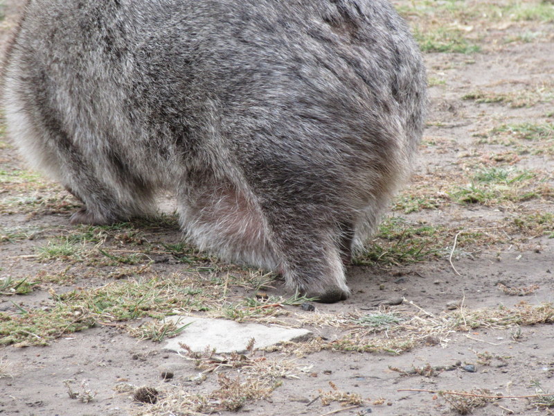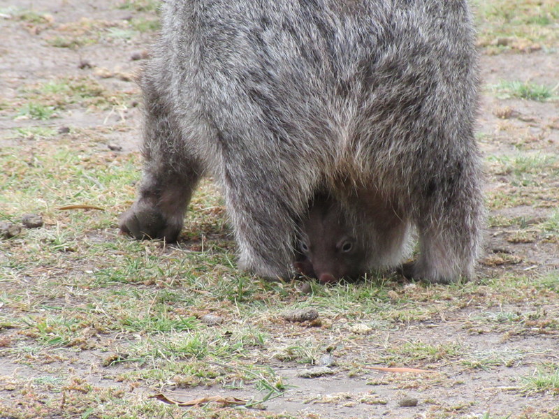 Apparently not wanting to be outdone by the devils, it seemed that the wombats also turned up the attention-grabbing cute factor last night and again this morning. While were having dinner last night, a female with a joey in her pouch waddled past the BBQ area. The joey was big enough to make walking awkward and cause the pouch to rub the ground. Eventually the mom reached the grassy area and the joey poked its head out for a photo shoot. For the record, wombat pouches face backward so that dirt doesn’t go into then when mom digs. Its odd looking but it works – see below.