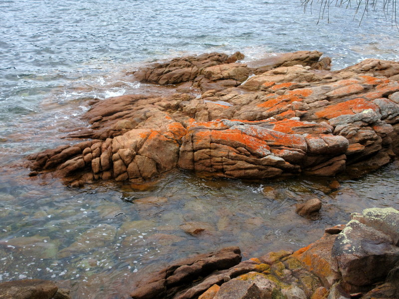 The walk includes 300+ stairs and goes up to a little saddle between two larger peaks that provides a view over the other side to Wineglass Bay. It was raining pretty good as we made our way to the top – it’s only about a 40 minute walk so really not that bad, though the rocky steps seem pretty slippery in the wet. There weren’t too many people on the trail – between the weather and the reduced number of tourists here there doesn’t seem to be a problem with crowds right now! There are some gorgeous rock formations in the park, and the peaks seemed particularly stunning with the wet showing off the colours.