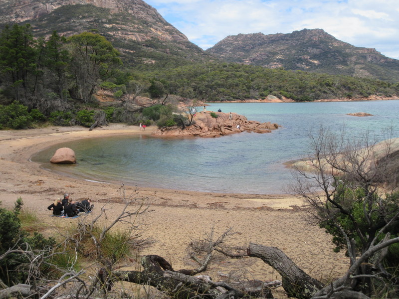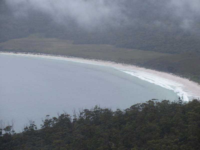When we finally got to the top we were rewarded with a view of Wineglass Bay, as the clouds had blown through enough to see down to the bay. It wasn’t quite the stunning view that you see in all the publicity photos, but it was pretty all the same. The viewing platforms and associated infrastructure is well done and on a nice day it would be a great spot to sit and have a bit of picnic lunch or just take in the views. It wasn’t quite ‘picnic day’ weather but we did hang out a bit to watch the clouds move across the various peaks, changing the views of the bay along the way.