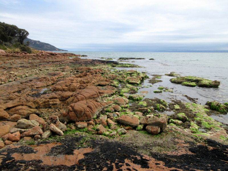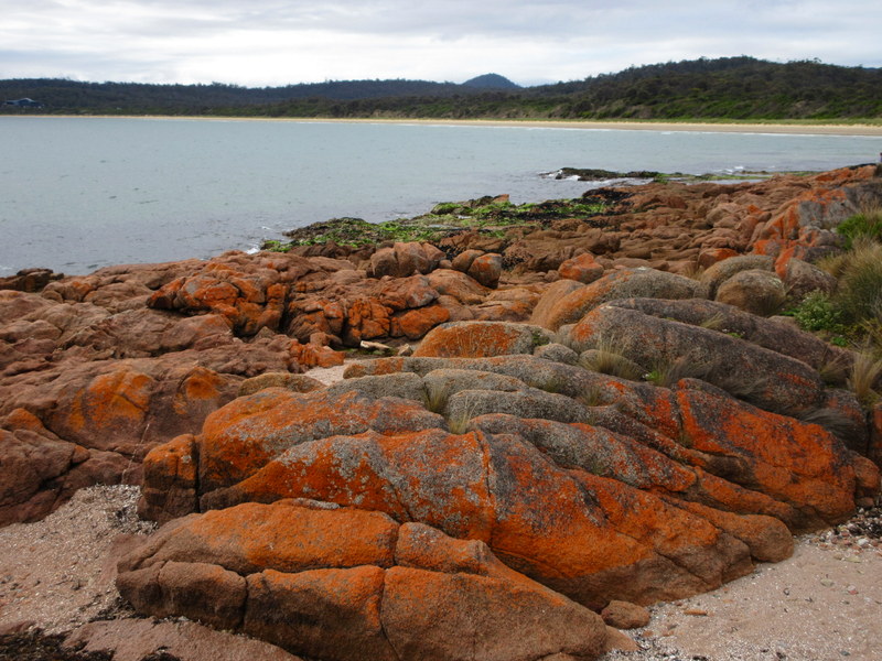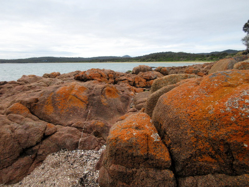 We are in the part of the coast where red lichen makes the coastal rocks very photogenic. We wandered the foreshore of Coles Bay for a bit this afternoon and got some interesting photos. I’m sure that they won’t be the last ones that we post. It’s easy to overdose taking photos– and hard to cull out just a couple to post.