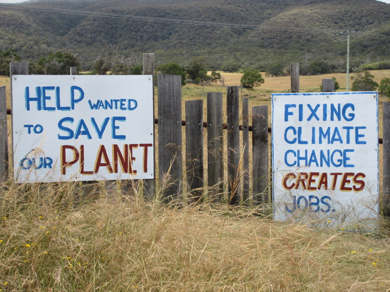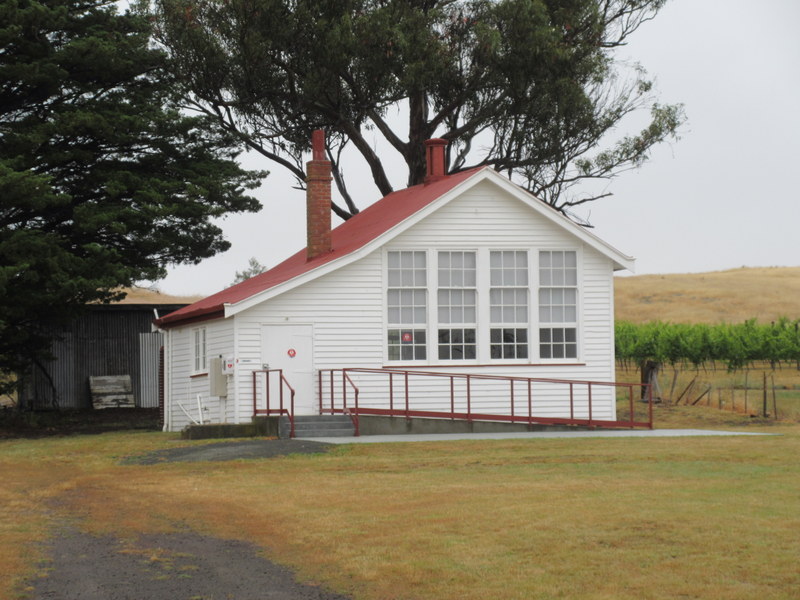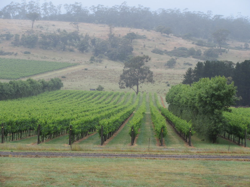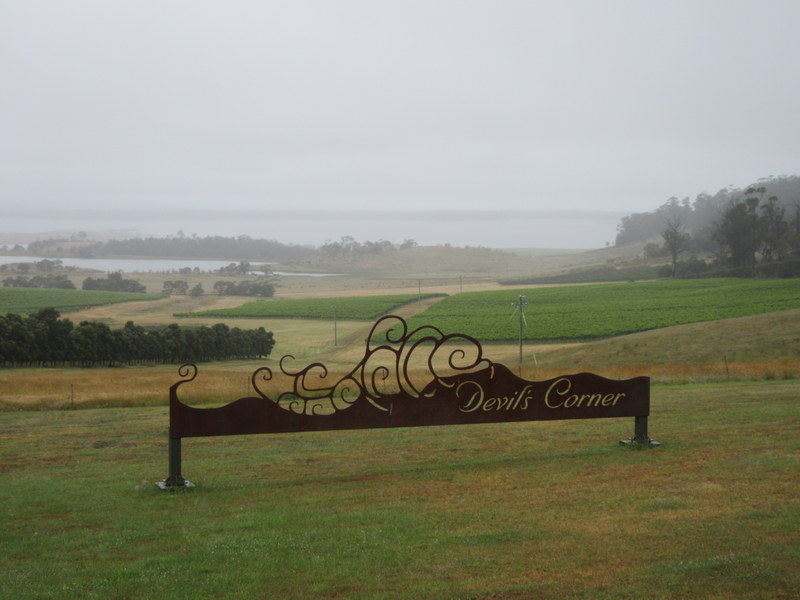 We rode past a few wineries today, though there was limited temptation to stop given the rain and early hour. We finally pulled over when we reached the Devil’s Corner Winery, where they’ve build a quite impressive cafe/tasting room/high-end fish and chips shops combo out of shipping containers. The site is noted for its views out over Moulting Lagoon and Freycinet NP. Today we got views of the middle of the clouds. I’m sure that it is pretty on a sunny day. We had a look around but didn’t sample the wines – they wanted $12 per tasting. Given that it was 10:30AM, even if it had been free we probably wouldn’t have had a sample. We just said hello, enjoyed the views, used the restrooms, and moved on.
