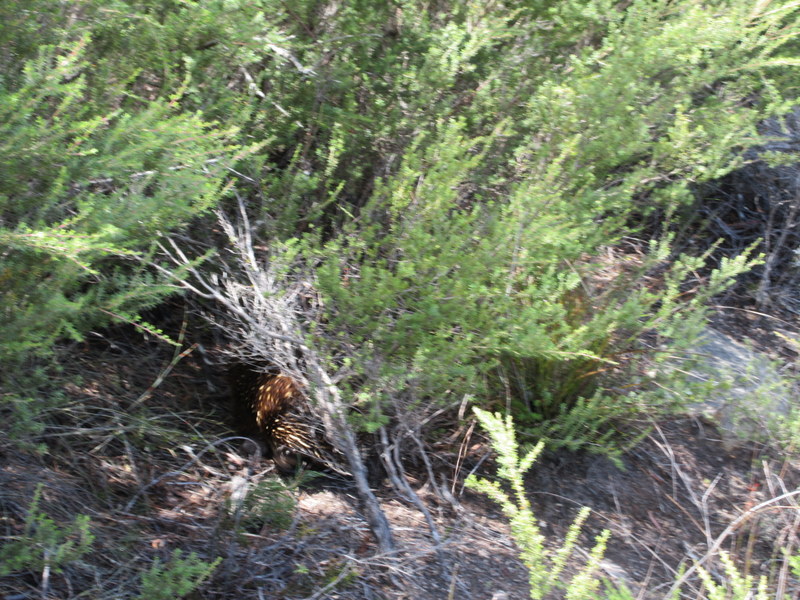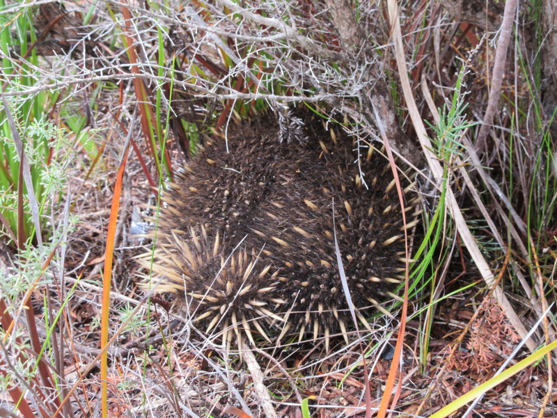It was about 30k from the Frog to Coles Bay. This last 30k was much better than first 30k, the sun even came out. We got to take off our rain gear and get dried out. On this section of road we spotted 3 echidna foraging on the roadside verge. They are the strangest animal. They are not bothered by cars but get pretty edgy when we stop and get off the bikes. Their first move is to drop to the ground and form a ball. Within minutes of becoming a ball, they hop up and make a beeline for the deep grass. We were never fast enough to get between them and the bush and when they reach the grass they dig their heads under a bush or clump of grass and form up into a ball again.