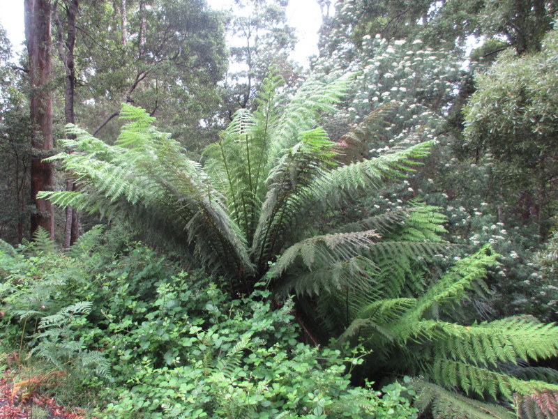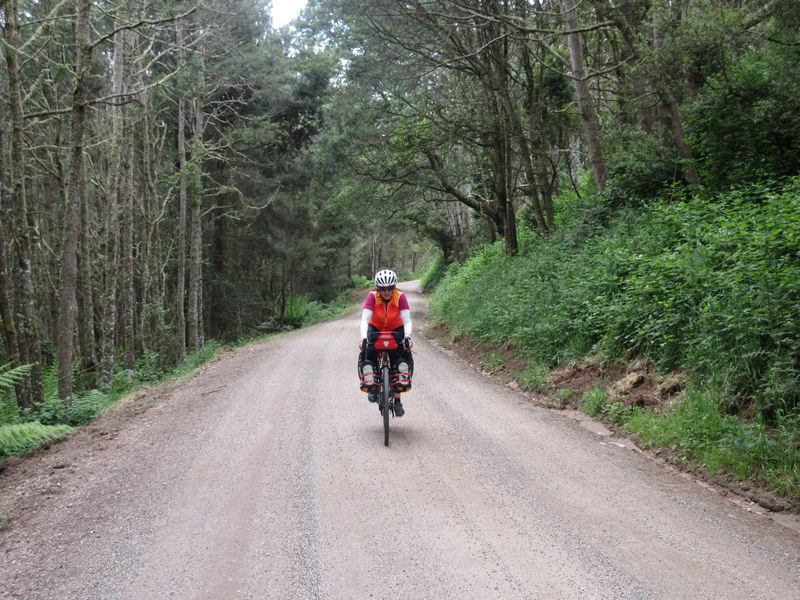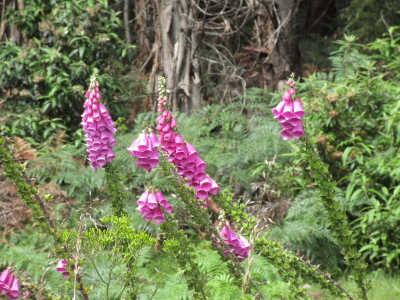 The second climb was pretty long, probably close to 20k, but it was not too steep and it took us up through a rainforest full of tree ferns and big, majestic gum trees. Near the top, save for the gum trees, we almost thought we were back in Oregon as we encountered heaps of blackberry bushes and foxglove flowers.  We had some nice distant views on the climb but we also got sprinkled on a bit. That was thankfully all the rain we got for the day.