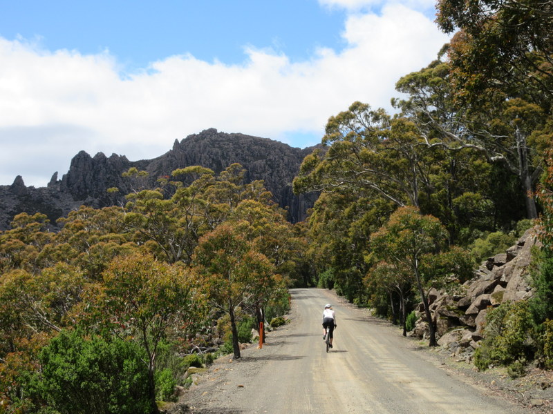 If anything, Jacob’s Ladder is anonymous. It’s in the middle north east of Tasmania, well off any of the main routes around the island. We spotted it in a cycle tourist blog a long time ago but have had trouble finding many references to it. If you come to Tassie just to ride around the island or only ride the east or west coasts, then Jacob’s Ladder will not be on your route, much less your agenda. Since we had “a day to kill” we decided that climbing a mountain would be fun. (Ok, I decided, but you know Nancy, she’s always game!)