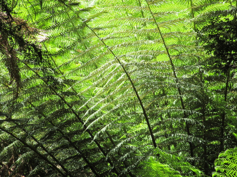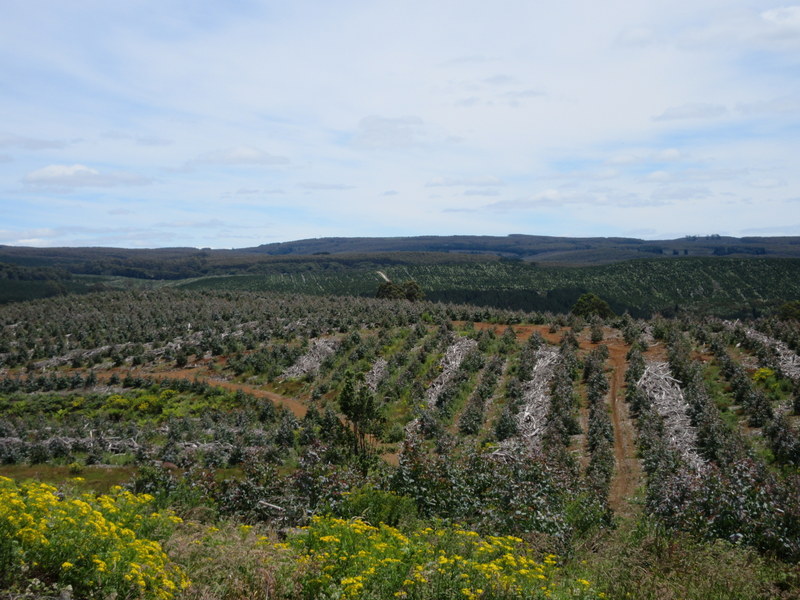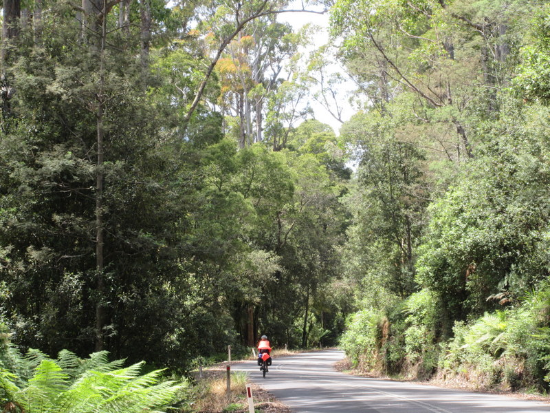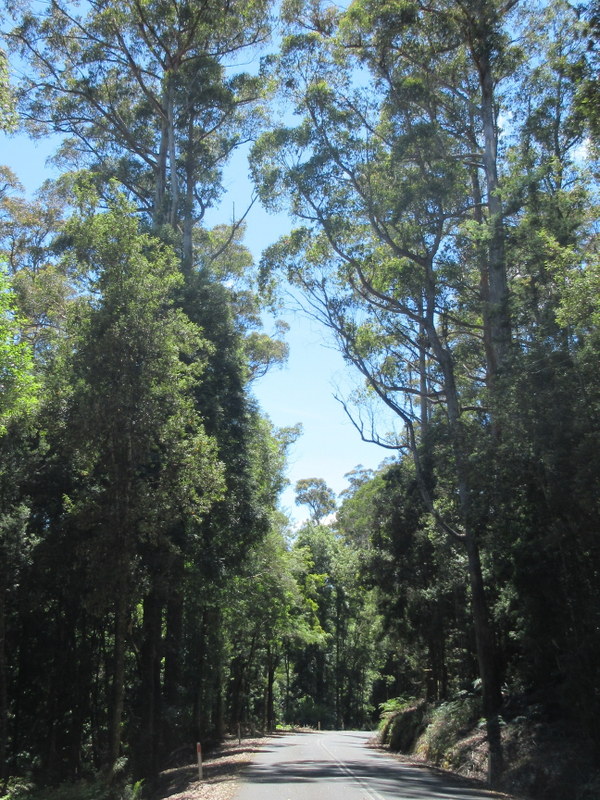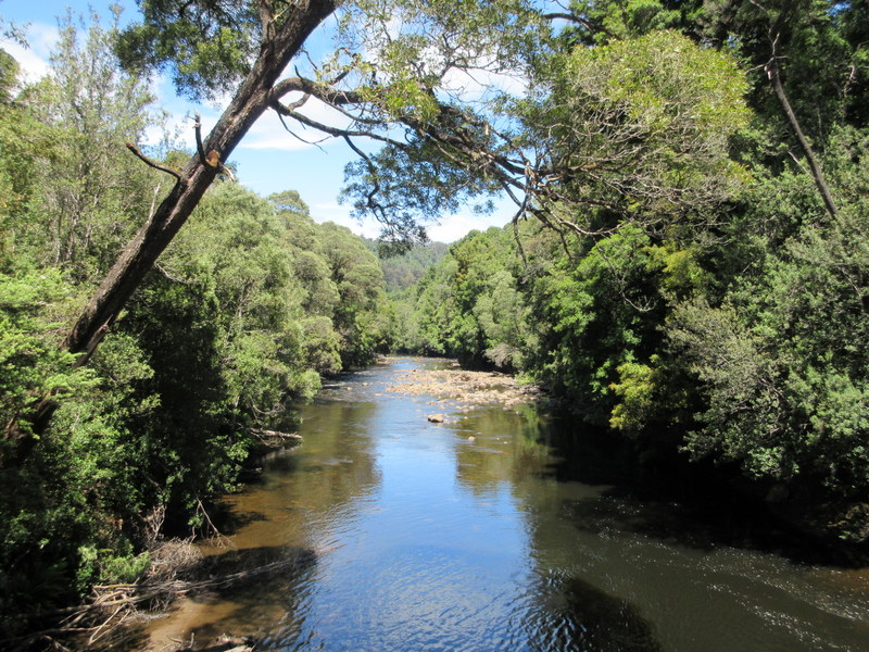 The narrow A10 was one giant tree farm for the next 20k – new gum trees, old gum trees, radiate pine and some fresh clear-cuts. We saw a few birds but no animals and it was pretty hot. Then we reached the entry to the gorge and a normal forest. It was moist, much cooler and there was some shade. The gorge was fun to ride down with about 6k of shallow decent – the forest smells were great. We pulled up for lunch at the bottom at the Hellyer Gorge Day-use area. We had originally planned on spending the night there and it would have been fine once it quieted down – lots of people were stopped to enjoy the river and forest walks. We were there before noon though, so onward and upwards for us.