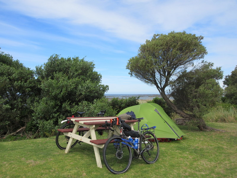 It was a further lumpy 18k down to the coast at Wynyard. We had some nice views out over the Bass Strait but they were earned with a couple steep climbs. The wind was coming off the shore at this point making the downhill slower. We had two caravan parks picked out and ended up at the Beach Retreat Tourist Park. The folks running it are nice and gave us the full rundown on tourist impacts due to Covid – they have been worse than we’d hard so far in Tassie. Our campsite is metres from high tide on the Bass Strait – hope the waves don’t keep us awake – no chance today!