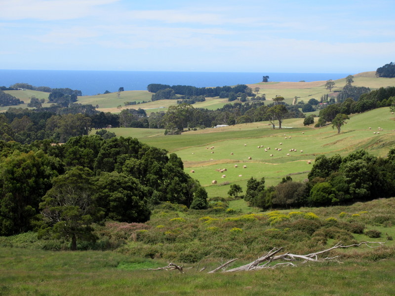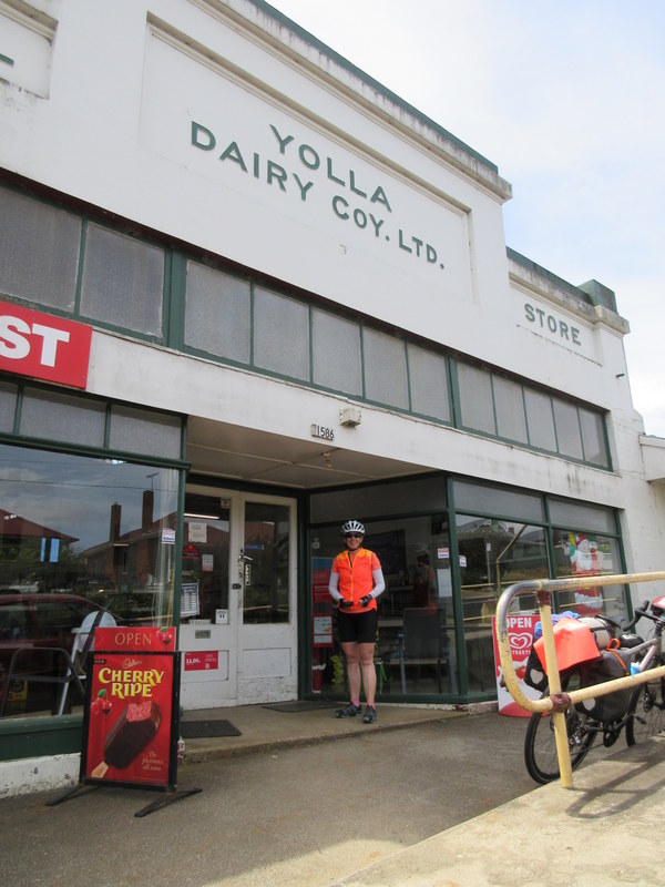 The climb back up out of the gorge was very gentle. It was dappled with shade but the mid-day sun had us heating up. Thankfully we took off our legwarmers at the bottom. Once at the top we had more down than up, but also some good short climbs to remind us how it felt. Our legs were getting tired. We stopped for a snack at the Yolla General Store, just missing their grill cut-off time and settling for sausage rolls. I mailed my Tassie license plate back to Sydney from the post office in the general store. Nancy says I can’t find any more or if I do, I have to leave them.