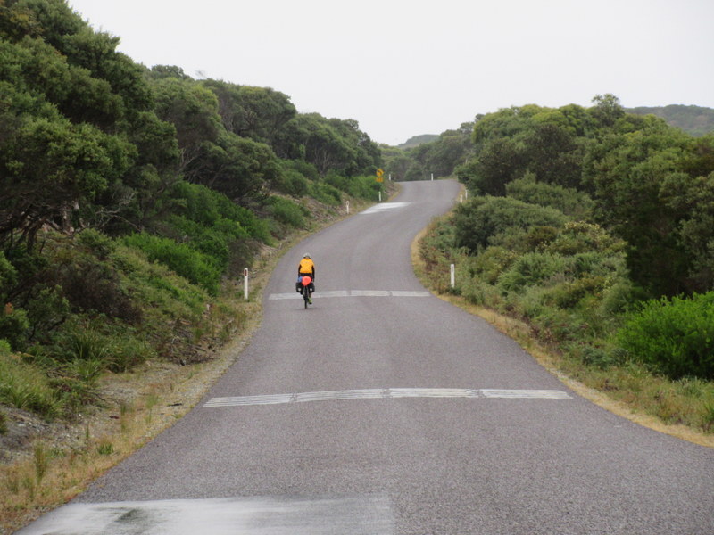 The first 15k was a lumpy ride along the northwest coast. We might have seen the water except the clouds and light rain limited visibility. This section of road is known to have a fairly healthy population of Tassie Devils. There were heaps of signs and a first time for us, Tasmanian Devil speed bumps. I don’t think that’s their official name but they are placed on the road specifically to get folks to slow down where devils might live.