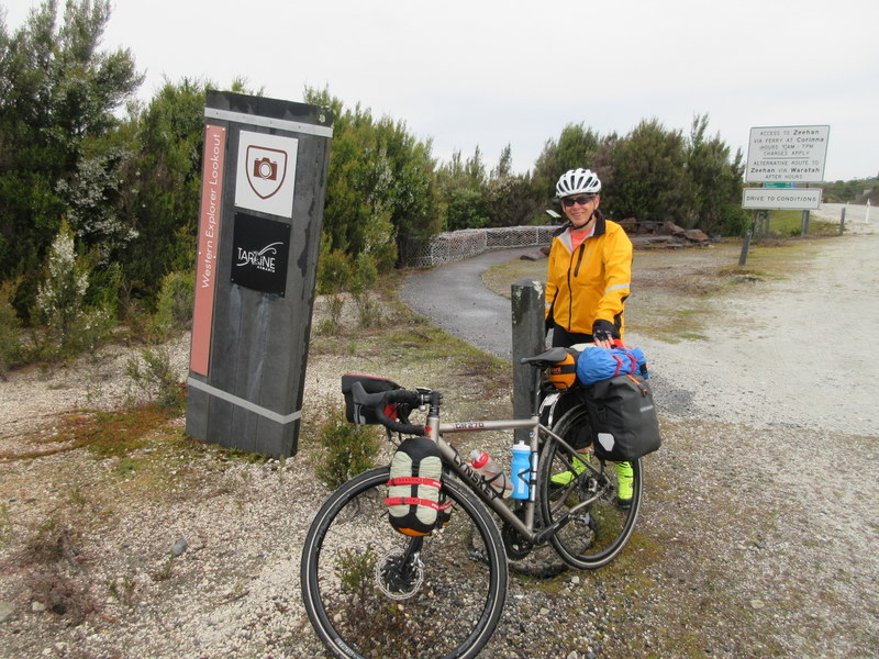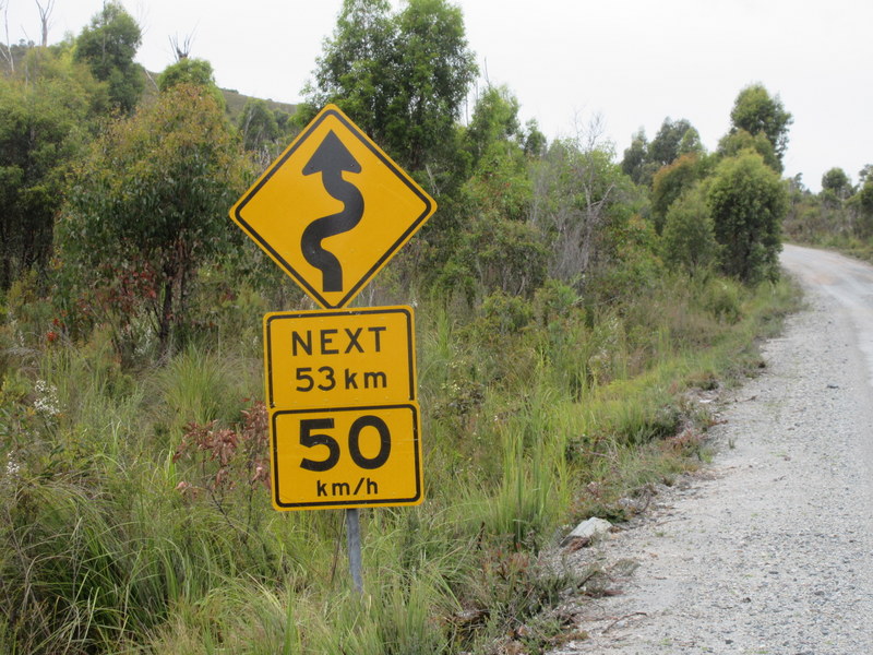 The end of this section was also the end of the sealed road for the day. After 33k of pavement, we got 80k of dirt on the highway known as the Wester Explorer – opened in 2008. We stopped at the start of the dirt to remove booties and raincoats and we did not need them the rest of the day. The first 10k of the dirt was probably the worst in terms of riding as it was newish gravel sand and deep in a few places. We didn’t have to walk any of it but it was slippery. It was on this section that we were passed by the first car of the day – 2.5 hours after we departed Arthur River. In fact, we were passed by fewer than 20 cars the entire day. We were definitely in the wilderness today.