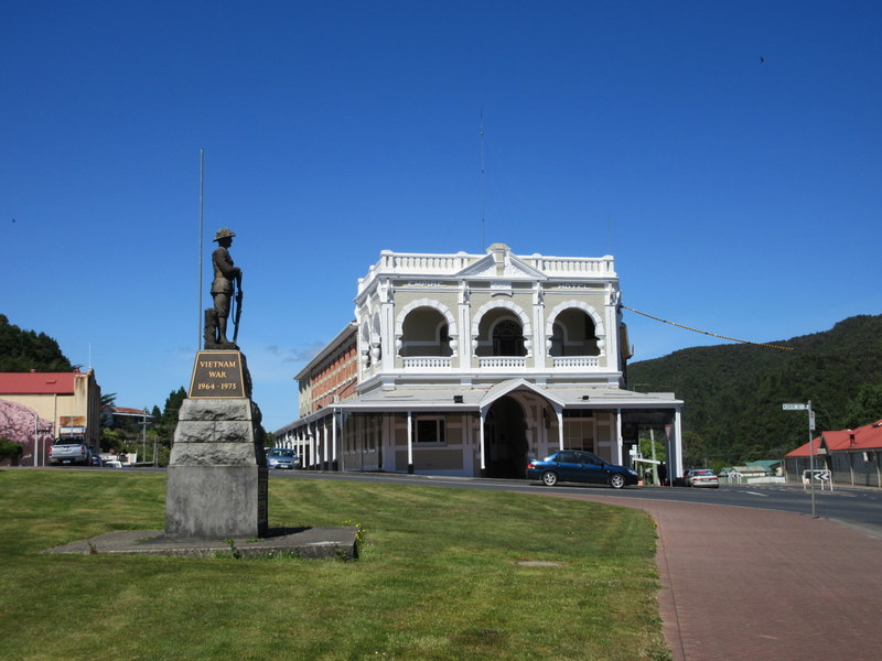 We stopped for morning tea in Queenstown and ended up being there long enough to call it lunch. We found a café and ordered egg and bacon rolls, plus a coffee. Several folks stopped to talk us, some local, some tourists. We met an older couple who lived in Gormanton – just 7k up the road from Queenstown. They moved there becoming the 5th and 6th people to live there. Later while climbing the big hill out of Queenstown we stopped at a lookout and met Peter, who was the 9th person to move to Gormanton – we talked to him for a half hour – he was a kick. Both of the Gormanton parties mentioned a chap from California who lived in Gormanton (everyone talked about his long beard). We never met said Californian but the three folks we met from Gormanton were so full of stories and energy, all of them had us completely entertained. It was really fun and completely different from our wilderness riding where we saw hardly any people at all.
