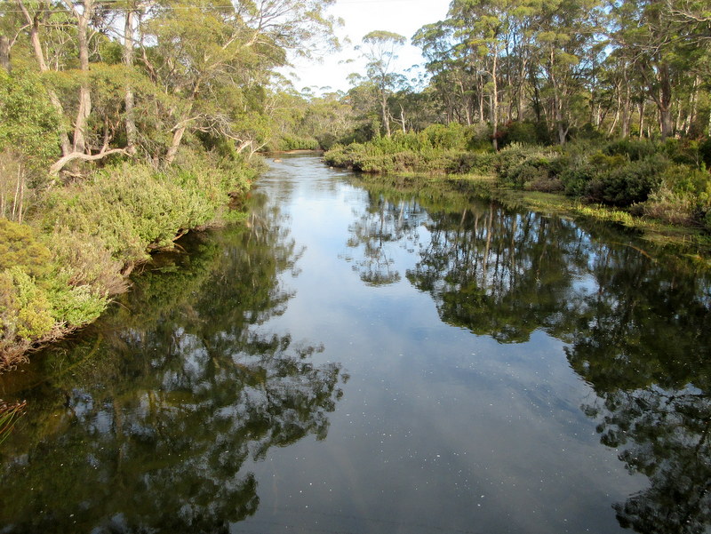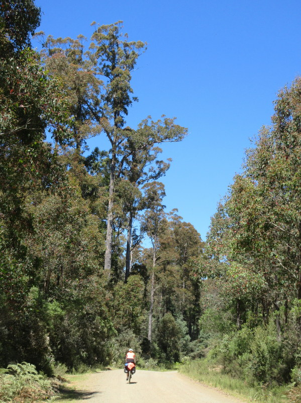 We continued on down the A10 for a spell before pulling off on the C601 (aka Fourteen Mile Road) – yes, that is a bit of down-step in road numbers and road quality. But it was worth it as the gravel road saved us about 10k, plus at least one major hill. The only issue with the Fourteen Mile Road was the traffic. There wasn’t much, one car passed from behind and two cars from the front. The issue was the second car passing from the front was driving way too fast for a dirt road and he didn’t like us being on the road. He yelled something about getting out of the middle of the road (there is no middle/side – it’s a one lane road). I’m pretending now that he yelled “have a nice day” and that his speed just distorted the words. At least he didn’t hit us and to be fair, we’d had so few bad car moments here in Tassie, we’re just writing him off as an aberration.