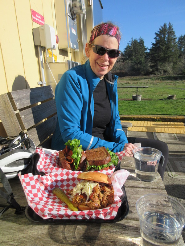 We planned on stopping in Cannon Beach for lunch and coffee but we were having so much fun riding in the dry weather that we decided to keep rolling. We made it to Seaside a little late but still in time to enjoy a great sandwich at Ruby’s, a roadside burger and beer joint. We’ve driven by the converted gas station many times but never managed to stop. So this time we took the opportunity for a late lunch to try it out. The food was worth the stop but we passed on the beer, being mid-ride and all. Some of our fellow customers at Rudy’s were “interesting” but we avoided political discussions.