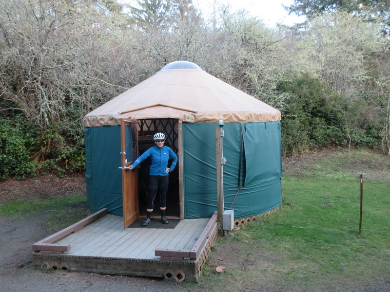 In February we’re heading to a couple national parks in southern California for a proper fancy bike ride, as a treat to ourselves for passing the big 60.  We are out of practice riding in cold and rainy weather, so training has been a bit sparse.  After endless days of rain and cold temperatures we finally had a clear weekend forecast this past weekend. We decided to ride from our current temporary ‘home’ in Manzanita up the northern Oregon coast to Fort Stevens State Park. And to make the trip even more fun, we decided to try out something we had been wanting to do – we booked a yurt (all that rain is making us soft!). As a bonus, doing a quick trip gave me a chance to dust off my blogging skills before the pressure is really on in February.
