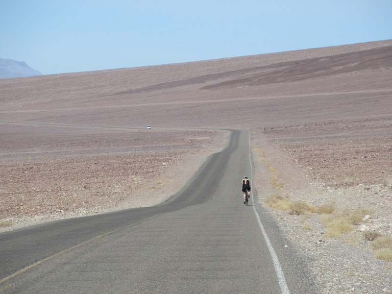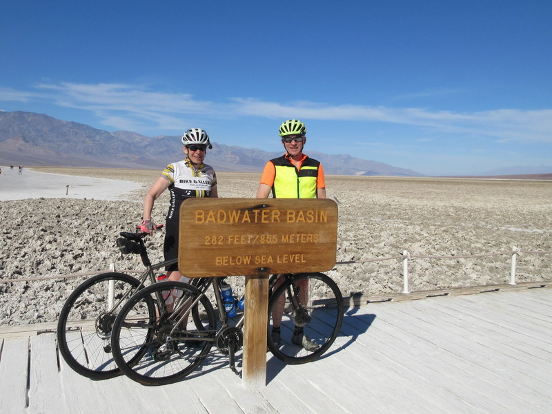 Death Valley’s Badwater Basin is the point of lowest elevation in North America, at 282 feet (86 m) below sea level. It is about 85 miles southeast of Mount Whitney, the highest point in the contiguous United States, with an elevation of 14,505 feet. We didn’t go anywhere near the top of Mount Whitney even though it would be one heck of climb and descent. By training in Death Valley, riding mostly below sea level, we can now say that we were altitude training the last 4 months living on the Oregon coast. Who goes to sea level to altitude train?
