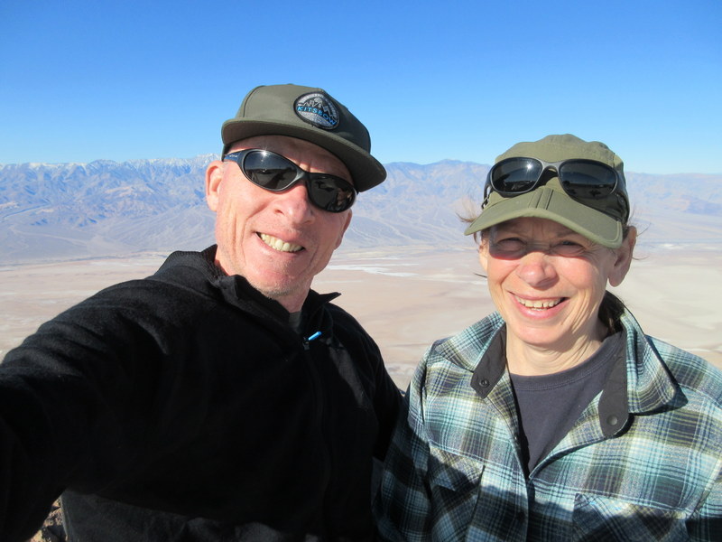 We had mostly great weather while in Death Valley. Daytime temps were in the mid-80s and nights low-60s. We had a wind storm one night but it was not too bad and our four-season tent survived. We got in a couple rides (44 and 47 miles), one out to Badwater (you have to ride to the low point after all) and a second one up to Stovepipe Wells (up, as in up to sea level – Furnace Creek is at -191 feet below sea level). It is winter here but we are not complaining about the weather, 85 is way lower than the 138F which was measured in the summer in 1913 – the highest temperature ever measured on earth, they say. We barely saw a cloud for the entire three days.