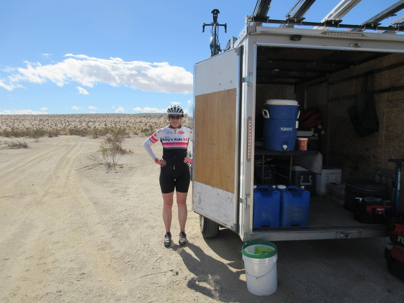 So finally, after a couple hours in the van we reached our final destination and started riding for the day. And boy was riding fun. The wind was more or less behind us the whole ride. We had uphills where we were coasting in the high-teens and downhills where we ran out of gears. Riding with wind like this is kind of like a drug. You almost start to believe that you are strong enough to ride that fast all the time. Our bubble burst half way back to Salton when Jason set-up a mini snack stop. We had to stand in the lee side of the trailer so as not to be blown away.