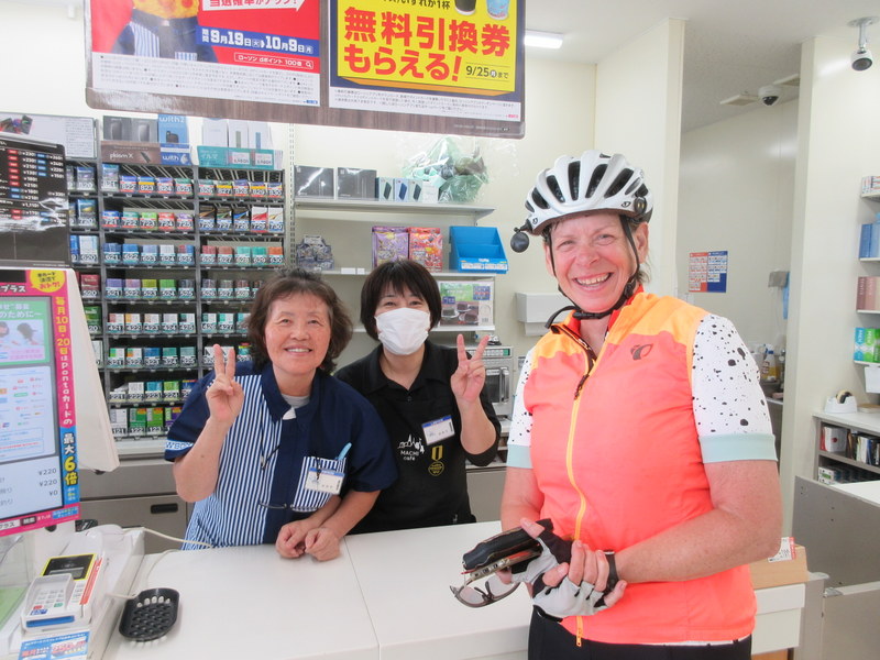 We pulled over at a Lawson (convenience store) because we saw two clearly European looking touring bike set-ups. Inside we found Jenne and Anna, a nice couple from Holland on the Japanese part of 7 month tour that includes Korea, Japan and SE Asia. We had a nice visit and discovered that they are staying in the same inn as we are tonight. After they left, the worker lady in the Lawson came over and gave us two free cold waters – Nancy befriended her and discovered that her daughter lives in Arizona.