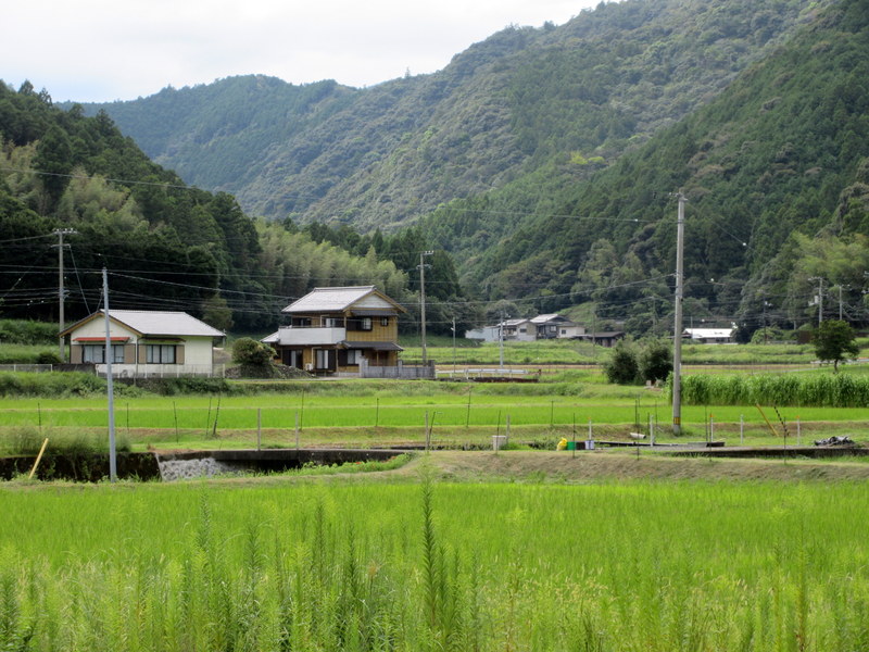 The road from there was still busy but traffic gradually thinned. Finally around 21k the highway split into a new expressway and an old highway. We obviously took the old highway. The next 30k were hillier but exactly what we had hoped to find in Japan and nearly traffic free. We saw lots of rice fields and traditionally styled Japanese homes. Many of the homes were overgrown and possibly abandoned. It’s hard to know if this was “generational abandonment” that we’ve read about in the international press or possibly just the fact that very little traffic takes the old road and all the shops and restaurants were closed. Whatever the cause, we thoroughly enjoyed riding a Japan road just like we had envisioned.