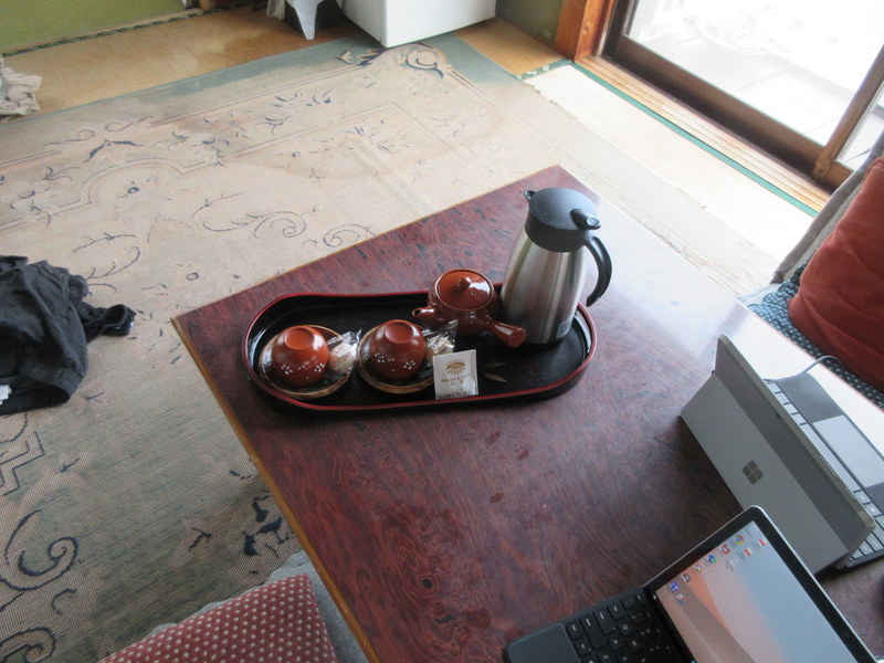 Our guest house is quaint. It’s our second tatami mat room in a row and there is only a bath, no shower. You have to go to the bathroom, sit on a stool, wash yourself, then you get to enter the tub of steaming hot water. The whole topics of baths here is worth a further post. Suffice it to say that we both enjoyed the soak on arrival.