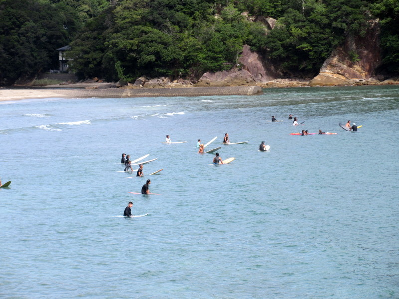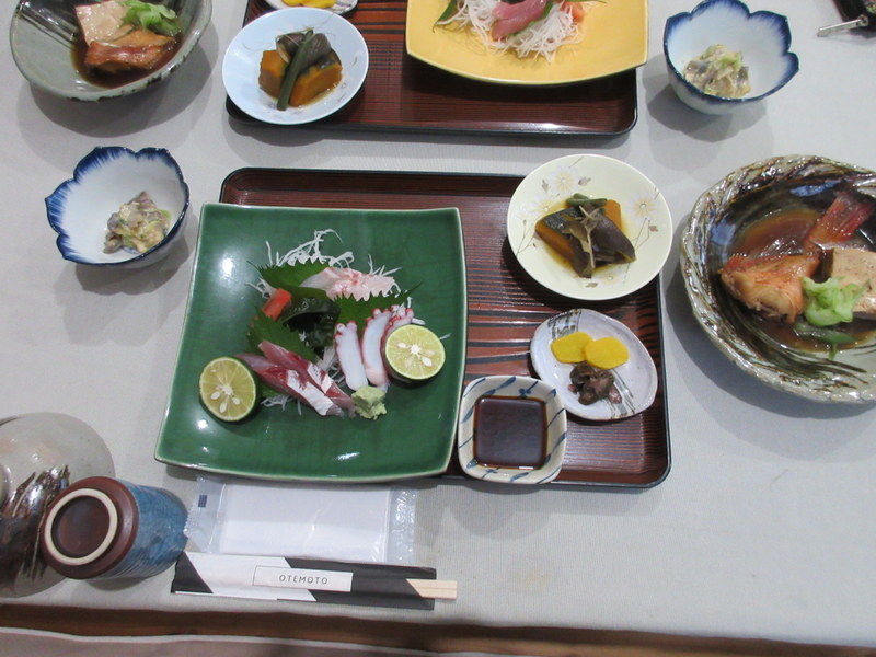After baths, the guest house owner brought us a nice tray of afternoon tea to enjoy in our oceanfront room. We supplemented tea with an old-time favorite junk food that Nancy discovered in the 80s while a student in Japan – not sure we earned that treat but what the heck. As for our room, it is stunning. It hangs over the highway, which is hanging over the sea wall, which is hanging over the sea. You could almost jump from our room directly into the sea – the noise is almost deafening. Too bad we can’t surf.