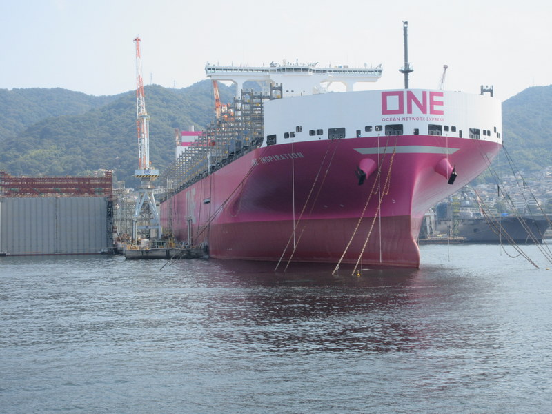 ONE – a massive new ship – to left in photo is a similar ship that doesn’t even look like a ship yet