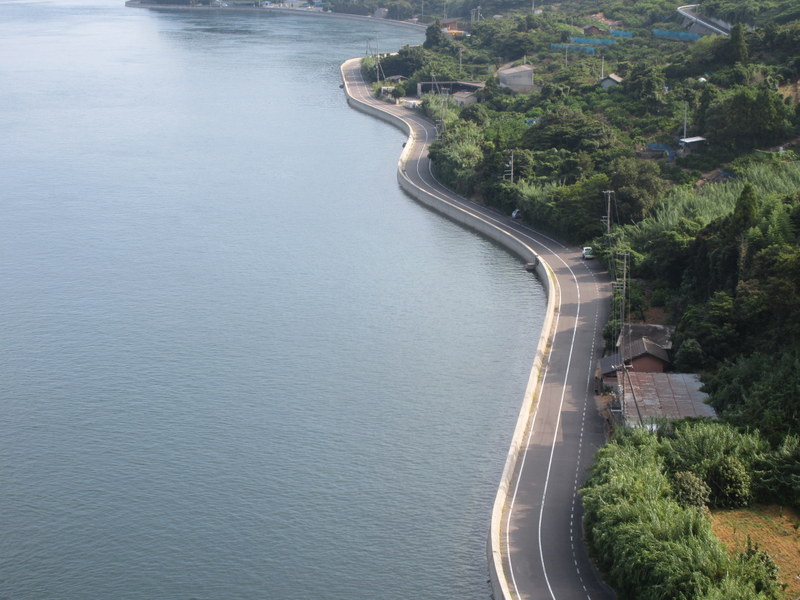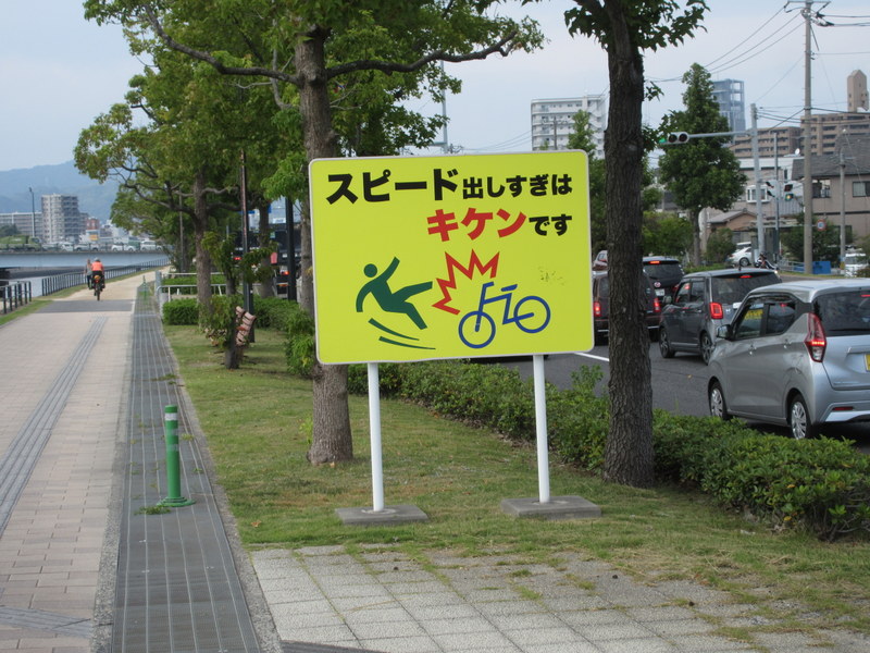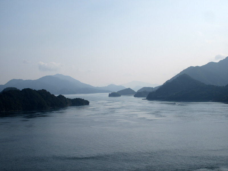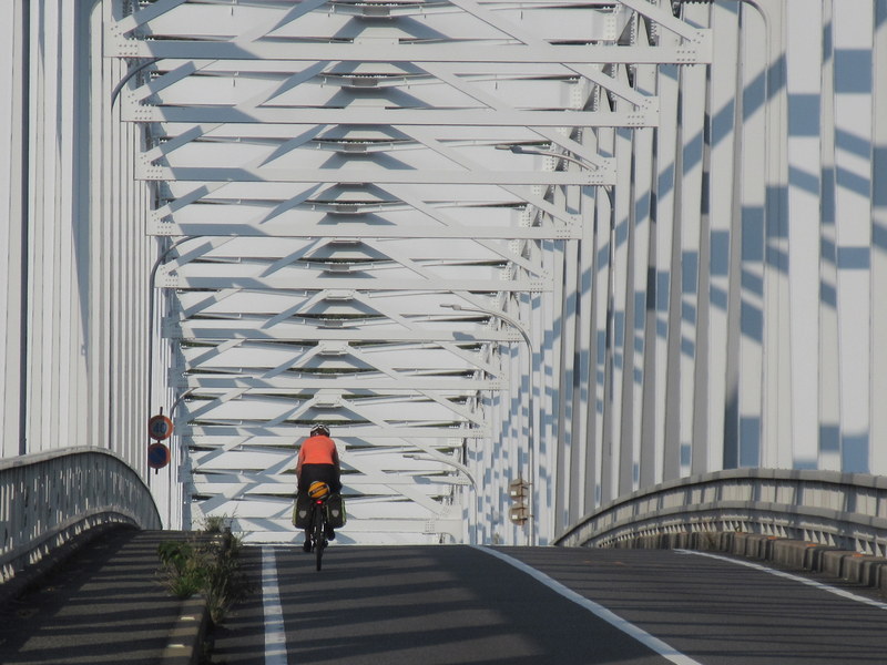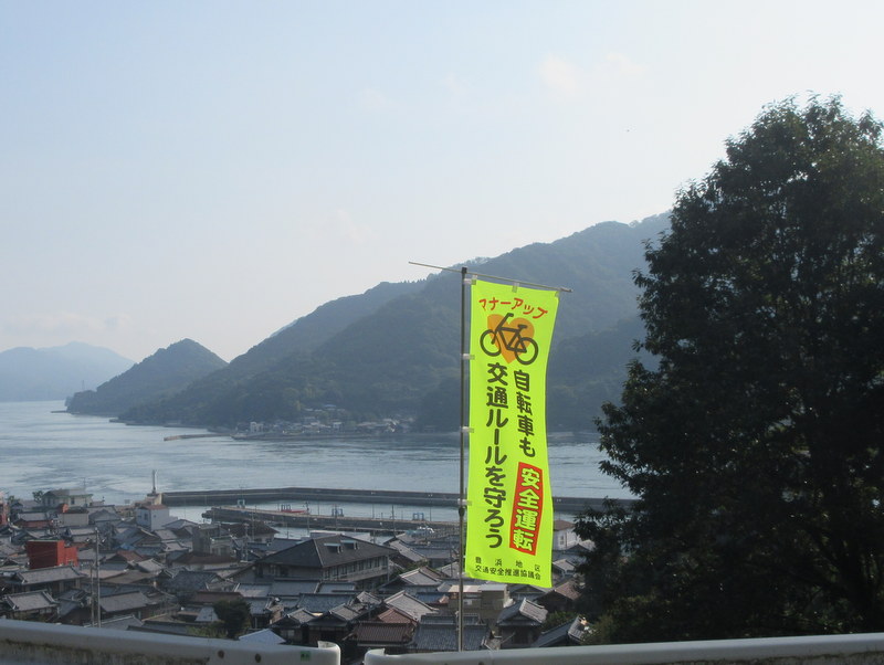 When we crossed the last bridge to Honshu, wow, talk about culture shock. Suddenly we were in the big city of Kure and traffic was full on. Our island adjusted brains had to switch to defensive riding big-time. The road was one lane each way for a while but before long it became 3 lanes each way. Traffic was polite, but there was a lot of it. Surprisingly, the calmest part of the whole last 15k through Kure was riding through the relatively new 2.5k Kure tunnel. They engineered the tunnel in a way that they could glass off the bike/walking lanes from the car lanes inside the tunnels. The glass was thick enough to block the traffic noise; even though you could still see the cars rushing past it was stunningly quiet and calm.
