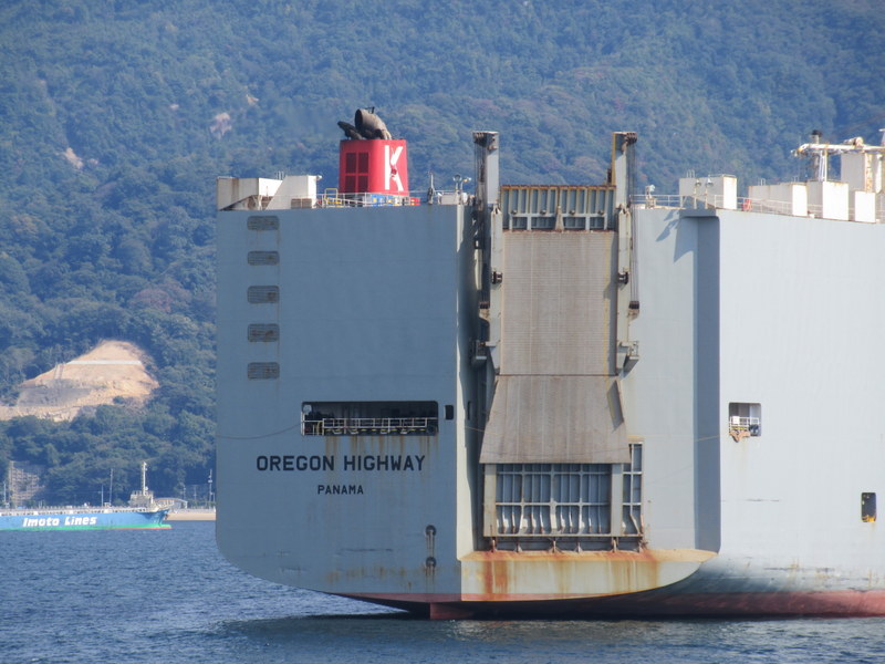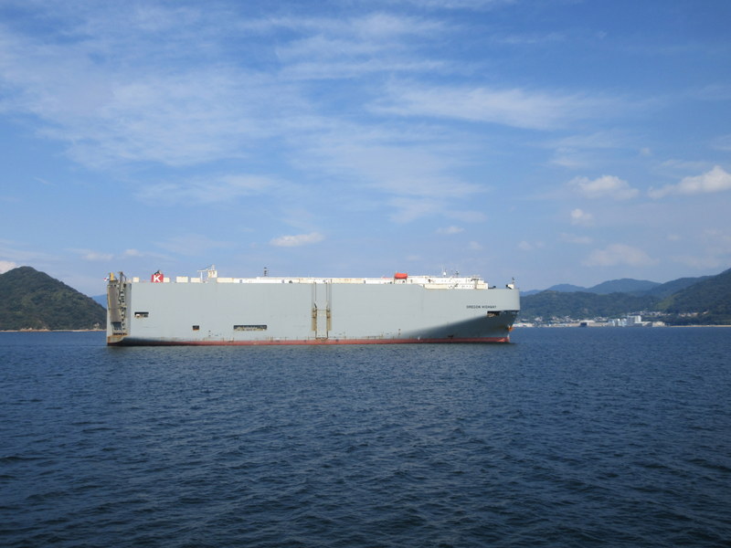 Kure is a pretty big city and home to some of Japan’s biggest ship yards. We caught the ferry in Kure so that we didn’t have to ride more traffic chaos into the bigger city of Hiroshima. On the ride out through the port we passed a couple massive new ships being built – hard to imagine how they even float. Out in the water between Kure and Hiroshima we passed a rusting car transport ship called “Oregon Highway” – probably waiting for a load of cars to be taken back to Oregon.  Portland is still sending and receiving auto shipments, including from Japan.