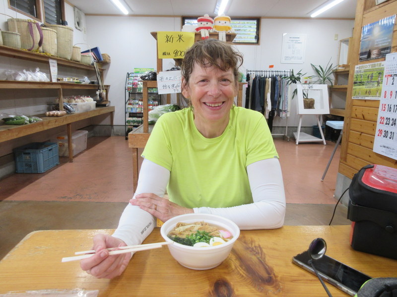 We had worried we might find food out here but managed a Lawson for morning tea, then a nice farmer’s fruit stand serving delicious hot noodles right at the noon hour. We had planned on the stand being open to buy veggies to supplement our dinner but it turns out we found enough things in Beppu last night so that we didn’t have to buy and eat a large bag of hot peppers. Clearly, the stand sells what is in season right now. No cold storage here.