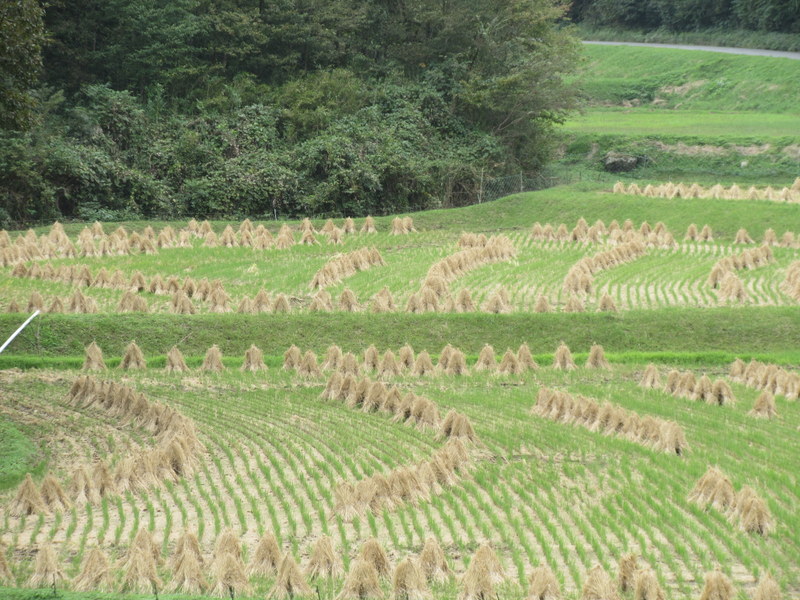 Tatami mats are made from rice crop staffs – a few fields had drying stacks – not sure if these are tatami bound as traditional mats are on the wain