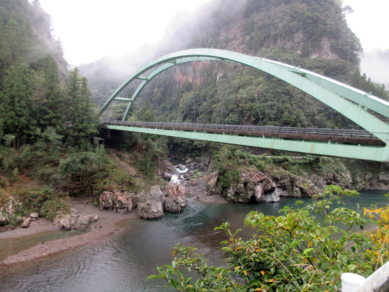 Our start took us further down the Takachiho gorge along the riverside road for about 6.5k. At that point, we ran into a “road closed ahead’ sign. I can’t blame Komoot today as they clearly noted the bridge out on their map. A few days ago when we were mapping the route and wanted to stay on the river, we forced the river route by putting a waypoint in at the bridge. Komoot did exactly what we asked it to. There was nothing to do about it but ride back up to the by-pass road and carry on. The by-pass road is way up the side of the gorge and just like yesterday, we had to follow some seldom used out and back tracks but eventually we made it.