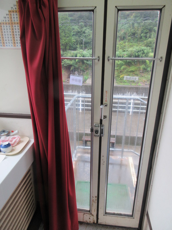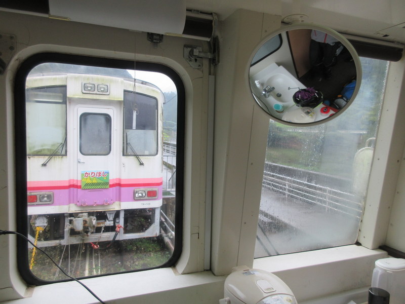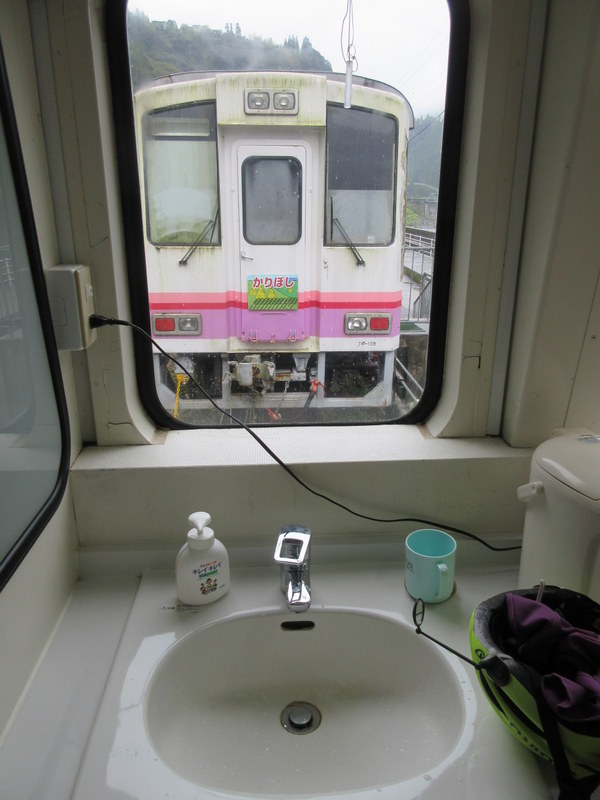 It was supposed to start raining at noon today but in fact it started last night when we walked over to the onsen restaurant for dinner. By the middle of the night, we could hear the rain on the roof of our train car. By morning it was coming down pretty steady. We delayed start for a while but eventually gave up, put on all our rain gear and just got on with it.