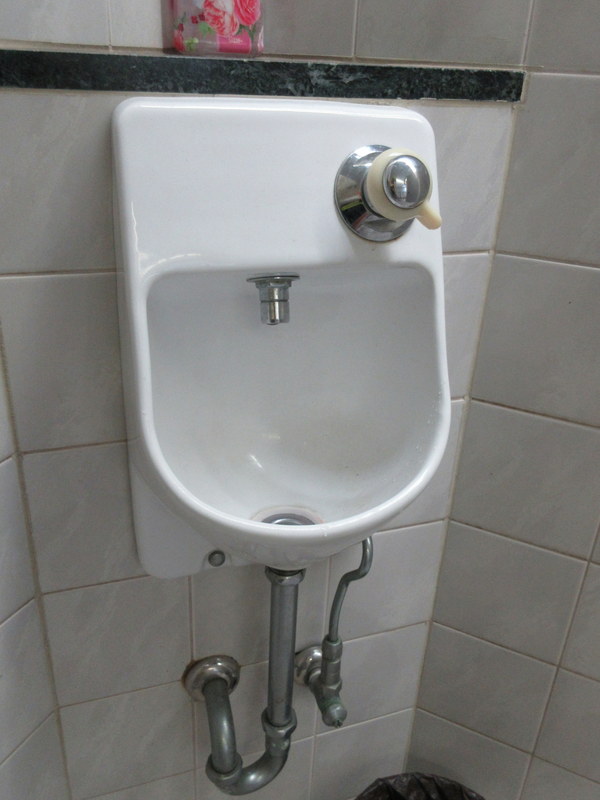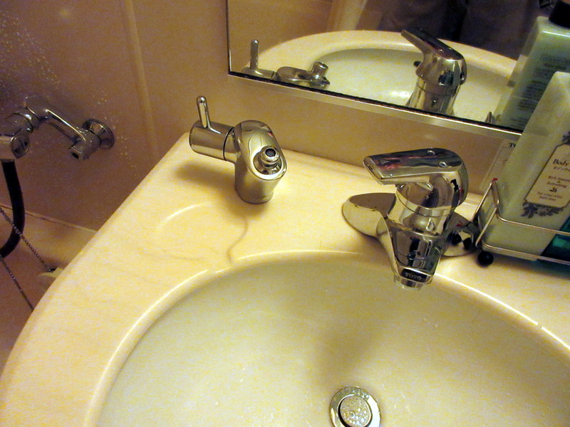 These old business hotels are funny. They almost always have a full room control electrical panel right at the bed so you don’t have to get up to turn anything on or off. They also often contain an odd water fixture or two – think bidet odd sort of. Last night we had a nice and shiny tap in the bathroom that we could not figure out how to turn on, or what it was for – see below. And the restaurant’s bathroom sink, while useable, was quite odd as well – see below also. I’m not sure these are one off, custom pieces or possibly found throughout Japan. Anyway, they gave me a chuckle.