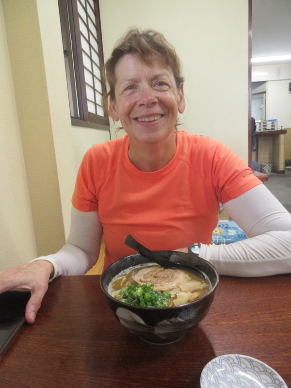 We came across a second rain squall but it looked minor so I decided to not rug up. Nancy stopped to put her rain coat again. I had in my mind that we were coming out to a main road and that there would be a roadside ramen shop where we could duck into for lunch. In truth, I had no clue, as Nancy has the GPS and is the only one of us who can read Japanese. Well, in one of those “blind squirrel finds a few acorns” moments, not long after Nancy got her coat on and started riding we came across a ramen shop. Nancy spotted the sign but this time I took a photo so I can be on the lookout tomorrow. The gal running the restaurant was really friendly and they served a super delicious ramen. And yes, the rain stopped by the time we finished eating.