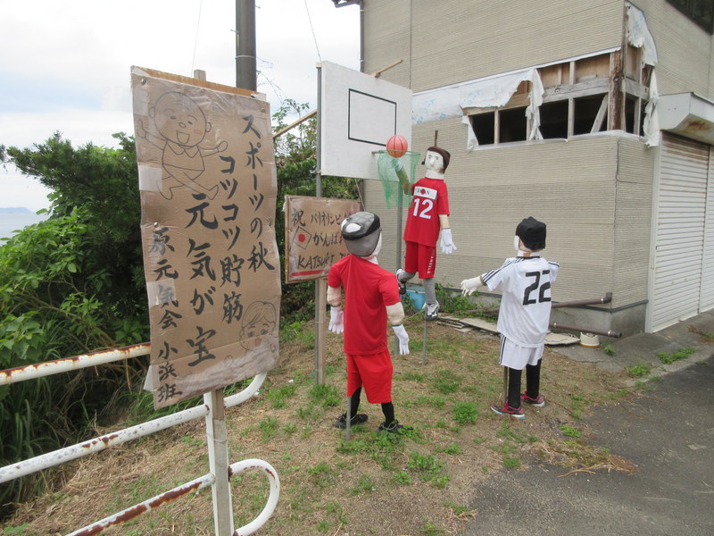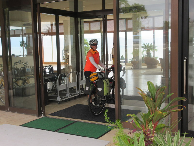 Making the 9AM ferry put us 2 hours ahead of schedule. Nancy had talked to a campground only 9k away – reservations weren’t necessary but we couldn’t “check-in” until 3. The forecast for tonight and early tomorrow AM is rain and there didn’t appear to be any covered areas at the campground. We waffled about getting a room, not getting a room, back and forth, back and forth. We ended up riding to the town information center at the train station and asking them to help. They were very nice and helpful – calling around to see if any places in town had room.  It’s the national sports period here in this town, starting today and going for a few days.  So there were lots of places booked out (apparently this is the town where all the badminton games get played).  The information gal found a room at a minshuku (think pension) in town, so we agreed to check it out.