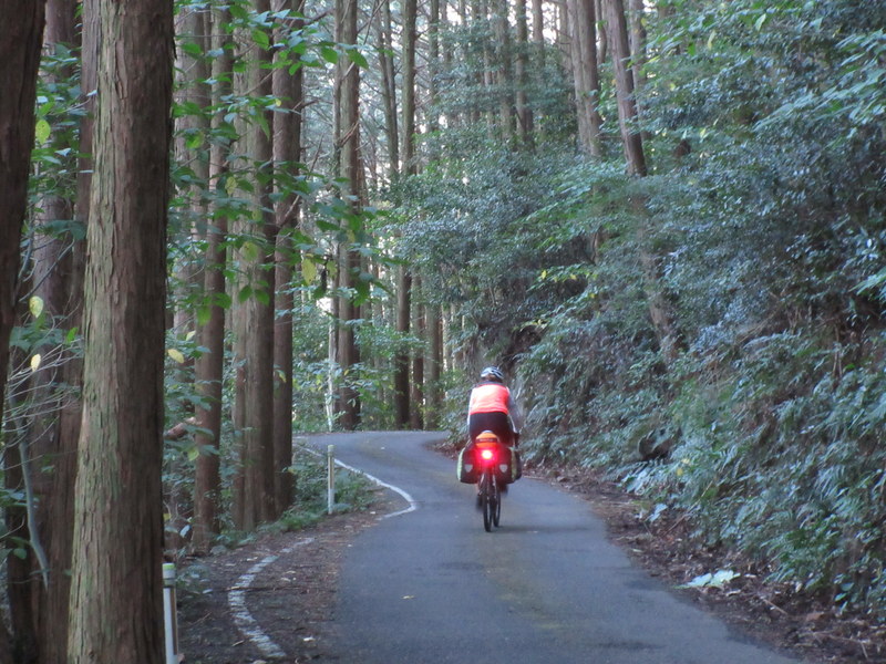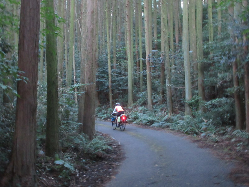 Making our own breakfast meant that we were on the road before 7am. And for the first time riding in Japan it was actually kind of chilly. We had a flat section as we rode along the water, then a small climb to warm us up. Then we hit the big climb for the day. And that’s where the ‘fun’ began. The road we took up to the Unzen National Park was very narrow and, as it snaked deep into the mixed bamboo and cedar forest it was also very dark. It clearly did not get much traffic as the road was covered in moss in many areas. There were a few houses toward the bottom of it, but as we climbed higher it was mostly just forest.