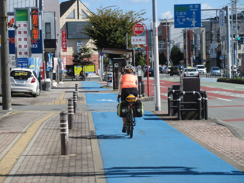 We continued to fight the wind on our ride into Kurume. We did follow the Komoot route for part of it when the traffic got a bit too intense, but when we ended up on roads that were relatively quiet or had a good shoulder or bike path we opted for the more direct routes. Komoot has a tendency to do a lot of diversions to avoid the bigger roads, but sometimes those bigger roads aren’t really very busy and it’s a bit frustrating to make a zillion turns through neighborhoods when it’s not really necessary. Anyway, we are getting better at making a call when we see how the roads are and mixing it up a bit when it works. Though it is a little nerve-racking to go off the route when you can’t read the signs! Dave doesn’t stress, he just keeps saying “are we on route” or “can you read that” – all very helpful with my stress levels.