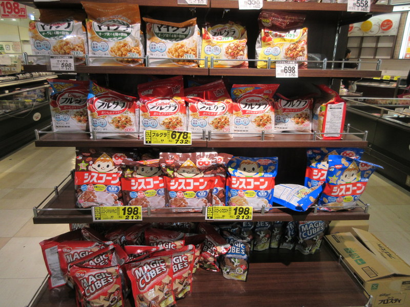 We then travel down the spread and cereal aisles. The entire spread section is included in the photo below. There is no peanut butter and no vegemite. Maybe I’m not surprised on the Vegemite but Nancy recalls her Mom bringing over a huge jar of peanut butter in the 1980s when she was an exchange student here. To think no progress has been made to introduce the Japanese to peanut butter –  shocking. As for cereal, the photo below is everything – four types of granola (two with chocolate) and Frosted Flakes. If you like cereal in the morning, adjustments will need to be made.