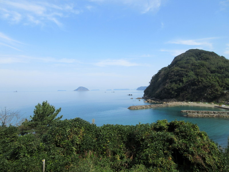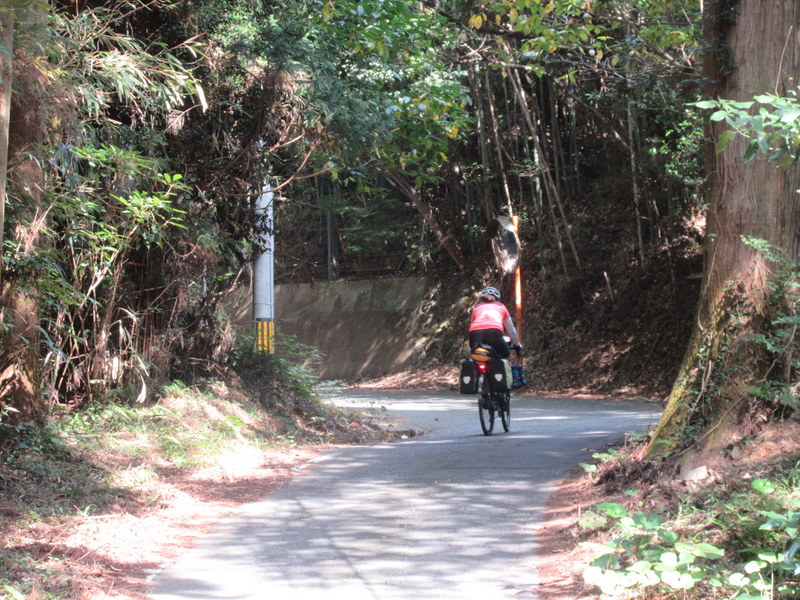 Our tent was wet but we got it mostly dried out and were on our way to the Fox Shrine (Motonosumi Inari ) before Officer Kato could have second thoughts and return. Traffic was zero – even with the stop at what seemed like a pretty touristy shrine, the first car of the day only passed us around the two hour mark. Komoot put us on some mossy goat track back roads today but mostly they also seemed to be pretty direct, if not occasionally hilly.