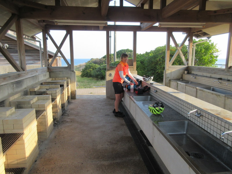 There are no chairs in the kitchen so we took our brekkie over to the surf shop and sat on their porch (as we did for dinner last night). It was more exciting this morning when about half way through brekkie, Officer Kato (the name I’m giving him) of the Ohama police force showed up to see what we were doing. He was kind of like the Japanese version of PC Perhale from the TV show Doc Martin. It sort of seemed like he was trying to catch us out but Nancy had all the right answers and had in fact called the surf shop a few days back to make sure that we were not breaking any rules. Officer Kato gook some photos, walked a lap of the camp and moved on. We finished our brekkie and think we have managed to stay off Interpol’s most wanted list, for now.