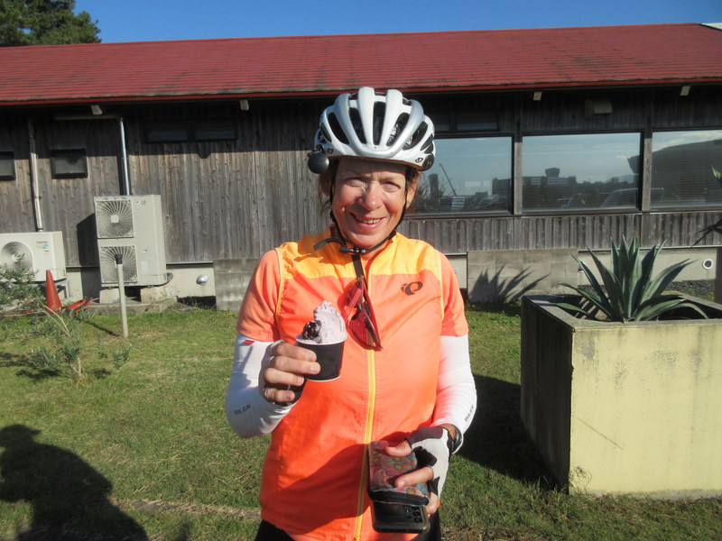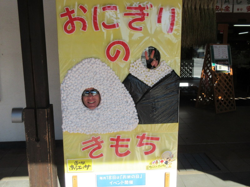 Once we left city roads, we had nice riding out mostly along the Sea of Japan. Today we asked Komoot to give us a route using “road riding” instead of “bike touring” as it’s routing method. The route ended up having much less climbing and for the most part we had quiet back roads. We stopped for morning tea at a michi-no-eki where Nancy snapped me turning into a 1-2-3 onigiri. I think we may have reached peak Japanese on this trip, I’m turning into Japanese food.