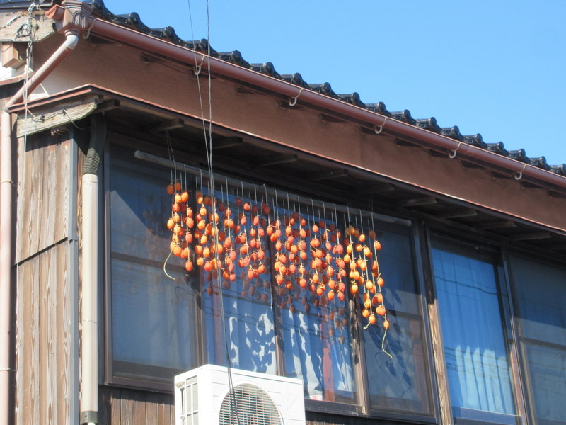 A few days back we started noticing persimmon fruits on strings hanging over doors and windows of homes. We’d seen a lot of trees loaded with fruit but not many folks picking them. Most of the leaves have fallen off the trees and the fruit looks almost abandoned. I guess they have to let it stay on long enough to ripen. They string them up to preserve them but they are also used in festivals and are a sign of good luck and longevity. Who knew?