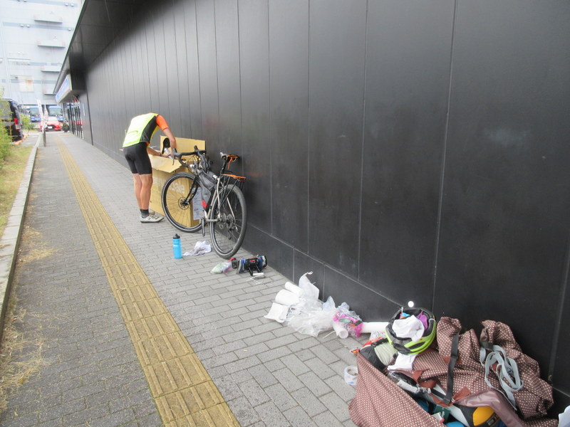 I was just trying to figure out where to go and a mall cleaning lady didn’t like where we were walking the bikes. It’s an outdoor mall with special bike parking off in the hinterlands. Even in super safe Japan, we are not parking our bikes laden with all of our worldly possessions off in the hinterlands. We just kept walking. The cleaner called security who met us to escort us to the proper parking area. It was all good natured and he completely lost interest in us before reaching any parking areas when some other folks with suitcases asked him for help. He was not really helping us anyway. We laughed, rolled our eyes and continued onto Tully’s where we parked the bikes “illegally” but out of the way and in a completely safe manner. We really try to be super careful not to offend folks but sometimes just looking like we do (foreigners in bright clothes with bikes) we must trigger something. Anyway, the Tully’s egg and bacon rolls were nice. And the bikes behaved themselves while parked.