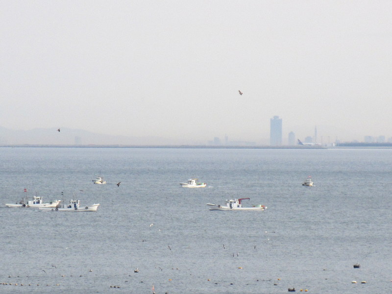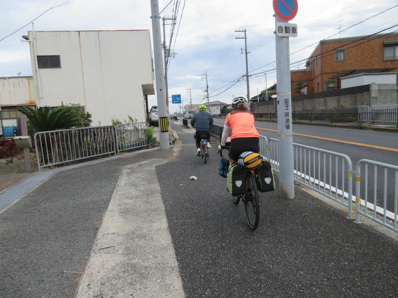 We could have easily have ridden yesterday’s and today’s rides all in one day, both days were easy and very short. It was nice, however, to have such a pleasant campsite to spend our last night at. The bench looking out over Osaka Bay was perfect for dinner last night and brekkie again this morning. This morning there were planes coming into Kansai, a small fishing fleet and a few curious Eastern Buzzards all competing for our attention. Both of us thought, heck, let’s hand out here for a while longer to prolong the trip. Neither of us said it out loud. And that’s a good thing.